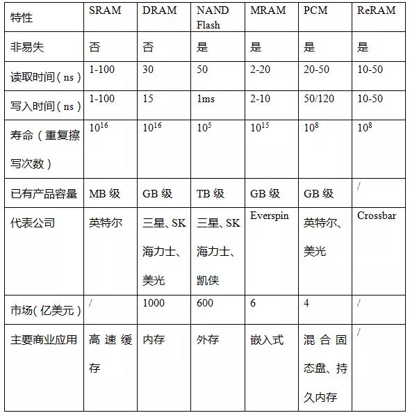 表 新型存储及传统存储特性对比